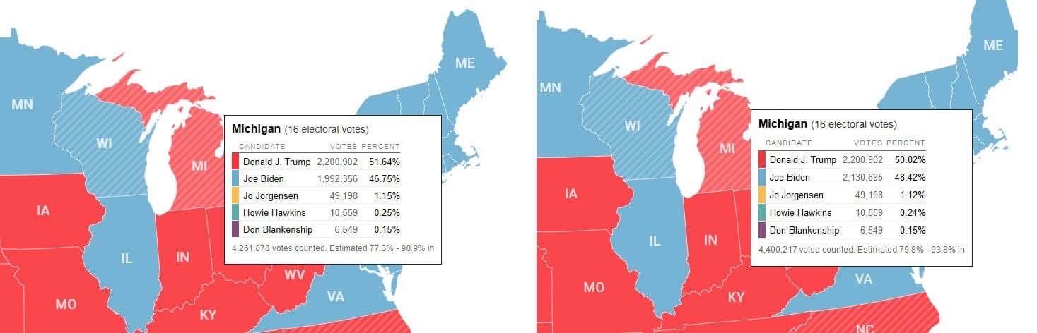 Dacă pierde în Michigan, Trump va pierde și alegerile, deoarece restul statelor unde poate câștiga: Pennsylvania, Georgia și Carolina de Nord nu îi vor oferi decât maxim 51 de electori, ceea l-ar duce la 267, cu trei mai puțin decât minimul necesar pentru a-și păstra funcția.