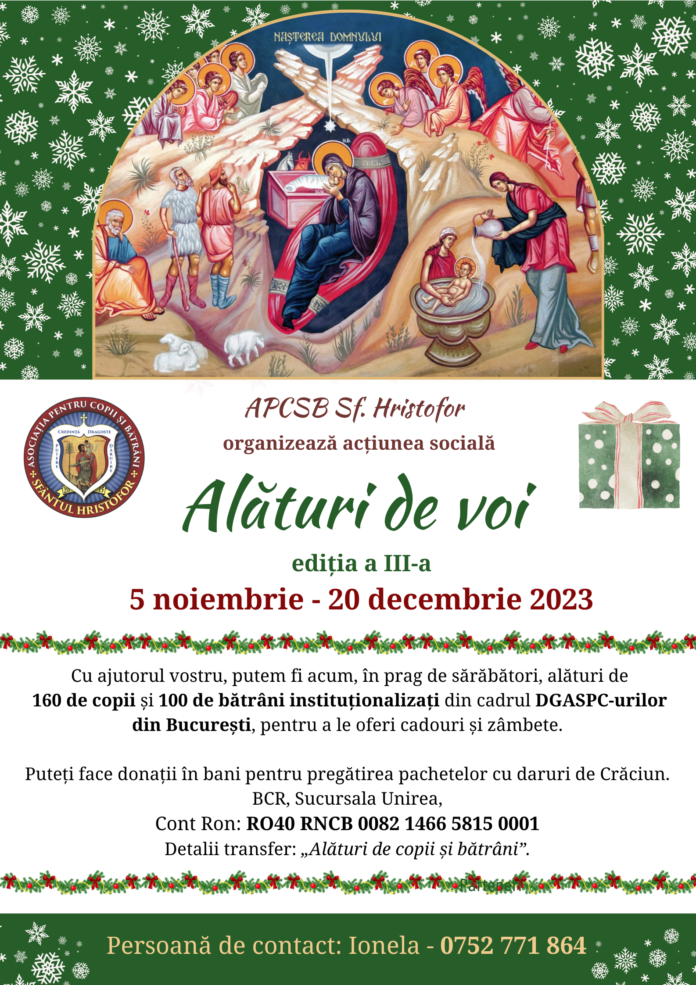Asociația pentru copii și bătrâni, Sf. Hristofor, organizează a treia ediție a colectei „Alături de voi”, pentr a ajuta 160 de copii și 100 de bătrâni insituționalizați din cadrul DGASPC-urilor din București.