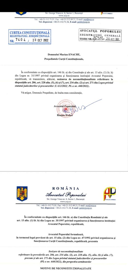 Instituția Avocatului Poporului, Renate Weber, a atacat joi, 20 octombrie, la Curtea Constituțională a României noua Lege privind statutul judecătorilor și procurorilor, adoptată recent de Parlamentul României, informează Lumea Justiției.