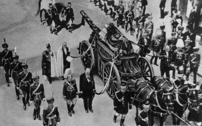 Poza din dronă cu înmormîntarea este lucrată rău de tot sau e făcătură ordinară; uni au umbre alții nu au. Pe vremea aceea erau deja fime color dar casa regală era săracă.