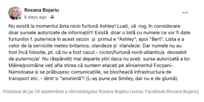 După ce climatologul Lucian Sfîcă a demontat întregul fake news cu ciclonul Ashley, la lumină au ieșit (prea târziu) și niște postări ale Roxanei Bojariu de marțea trecută. Climatologul din cadrul Administrației Naționale de Meteorologie a emis păreri similare cu ale lui Sfîcă.