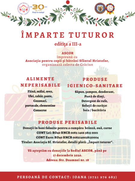 ASCOR București și Asociația pentru Copii și Bătrâni „Sfântul Hristofor” organizează o colecta de Crăciun „Împarte tuturor” pentru persoanele nevoiașe din București și județul Ilfov aflate în evidența Asociației Sf. Hristofor. Evenimentul a ajuns la a treia ediție.