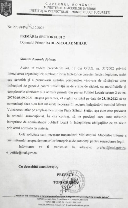 Conform acestui document, datat 24 octombrie 2022, Prefectul Capitalei, Toni Greblă, îi cere Primarului Sectorului 2, Radu Mihaiu, să comunice „dacă s-au luat măsurile necesare în vederea îndepărtării bustului Mircea Vulcănescu aflat pe amplasamentul din Piața Sfântul Ștefan”.