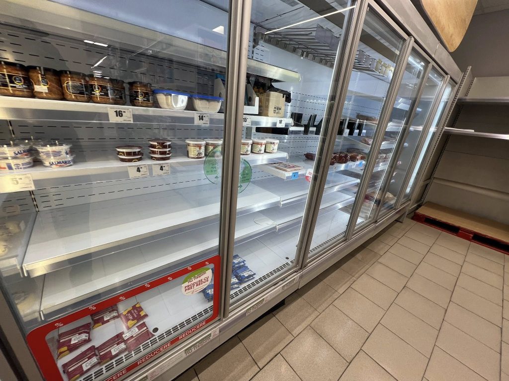 În imagini surprinse marți seară, rafturile magazinelor din Constanța arată aproape pustii: pâinea, laptele, iaurturile și alte produse esențiale au dispărut rapid. S-au vândut foarte bine pâinea (în unele magazine de cartier nu se mai găsea deloc), laptele, dar și fructele, considerate provizii indispensabile pentru situații de urgență.