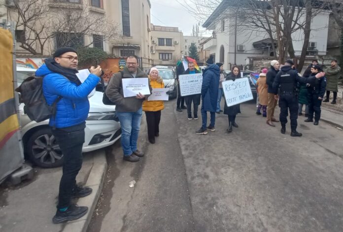 Aproximativ 10 persoane, între care și șeful asociației Accept (Pro LGBT) și deputatul Cătălin Teniță (Reper), au protestat în fața sediului AUR din Capitală.