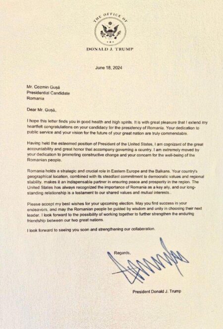 În textul semnat de Trump, acesta îl felicită pe Gușă pentru candidatură și se arată „profund impresionat de devotamentul dumneavoastră în promovarea schimbării constructive și preocuparea dumneavoastră pentru bunăstarea poporului român”.