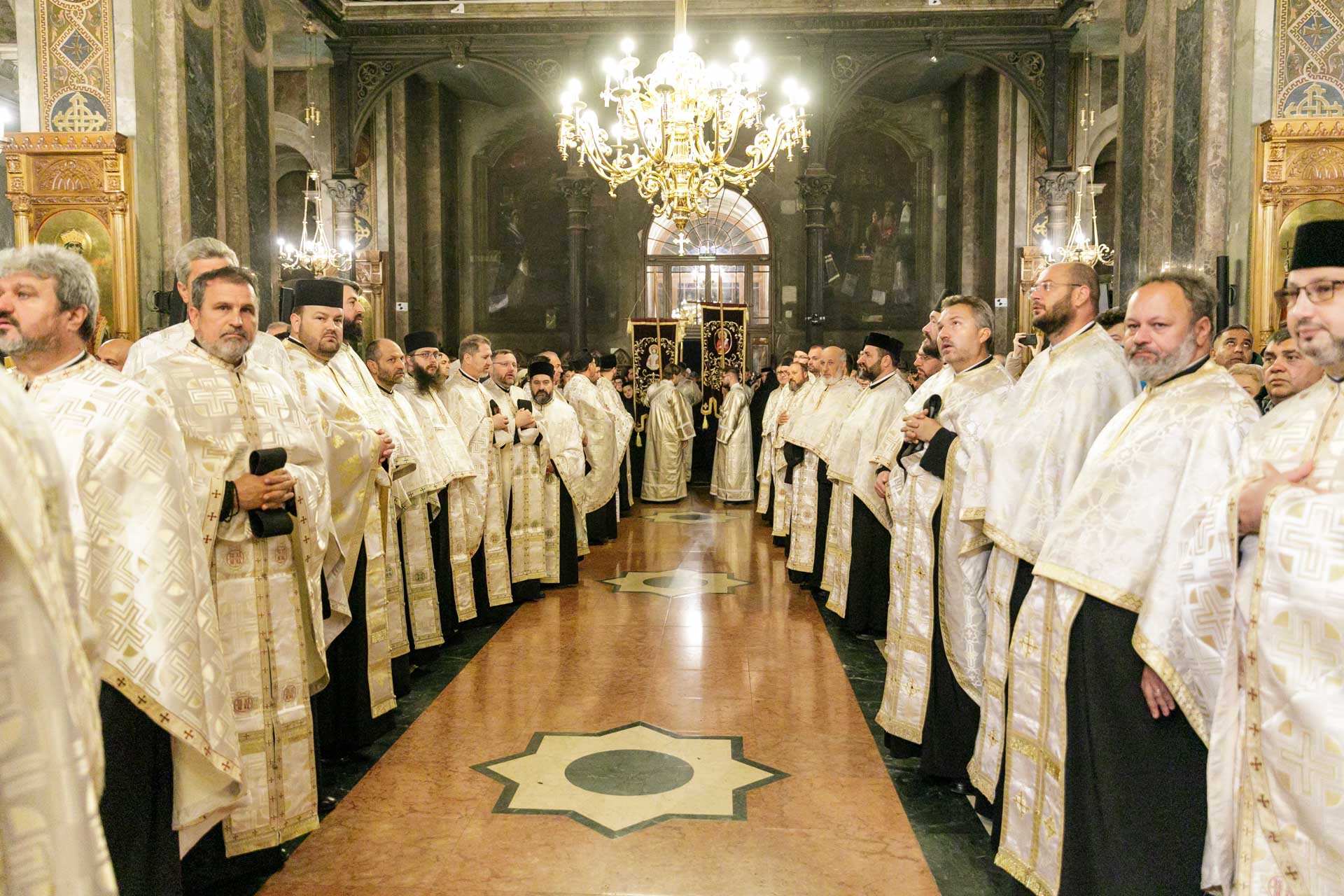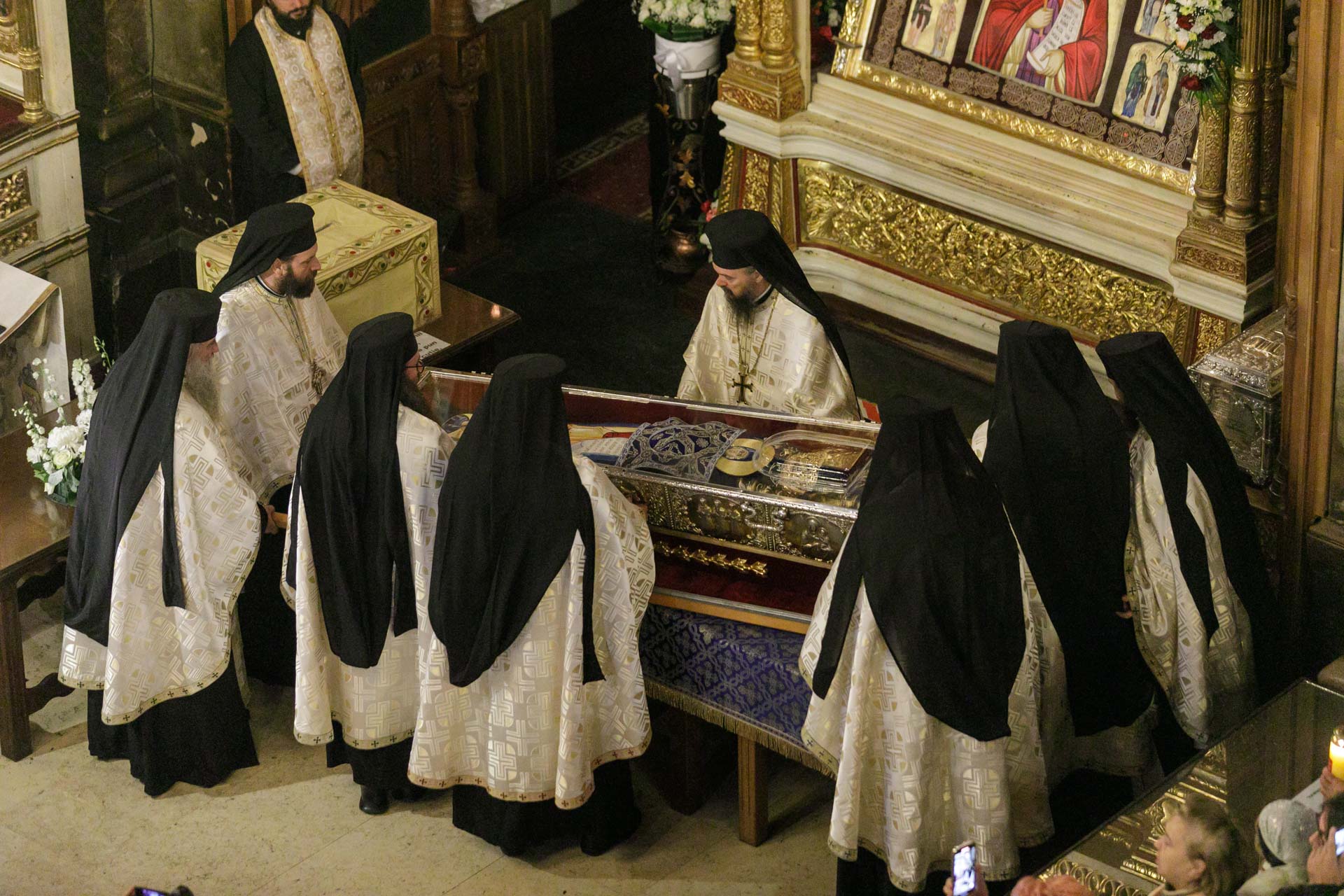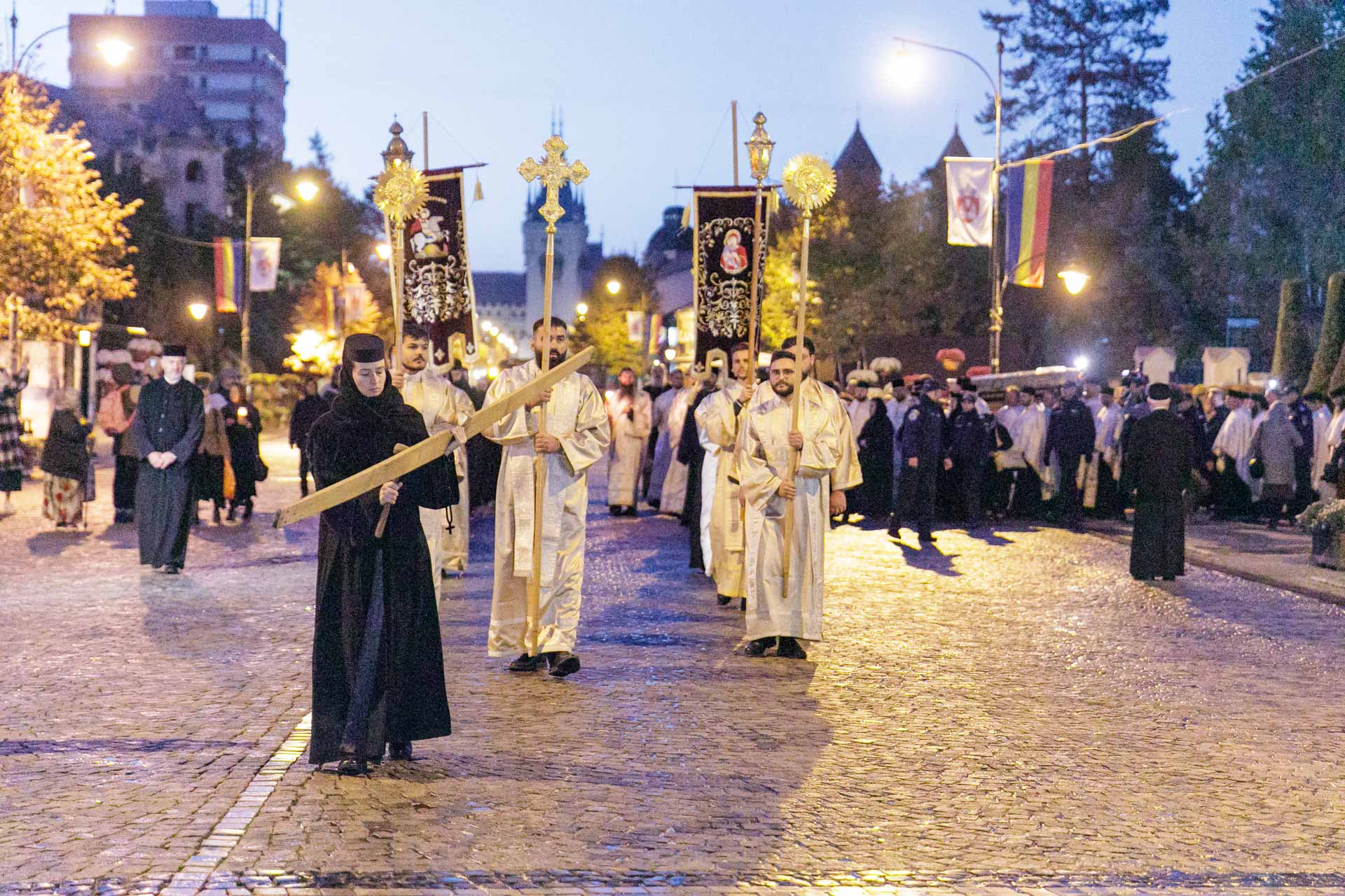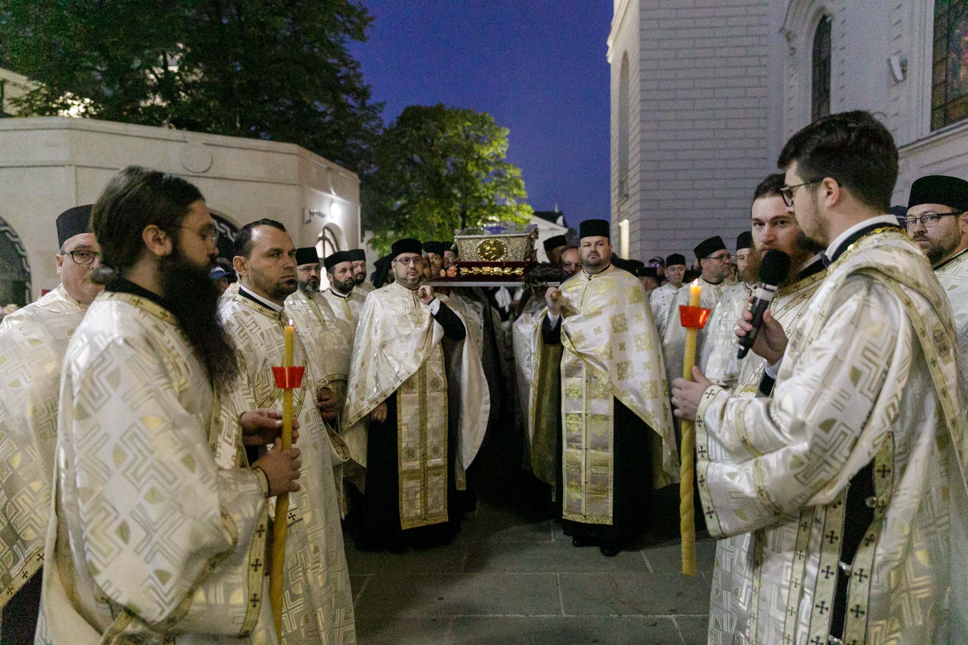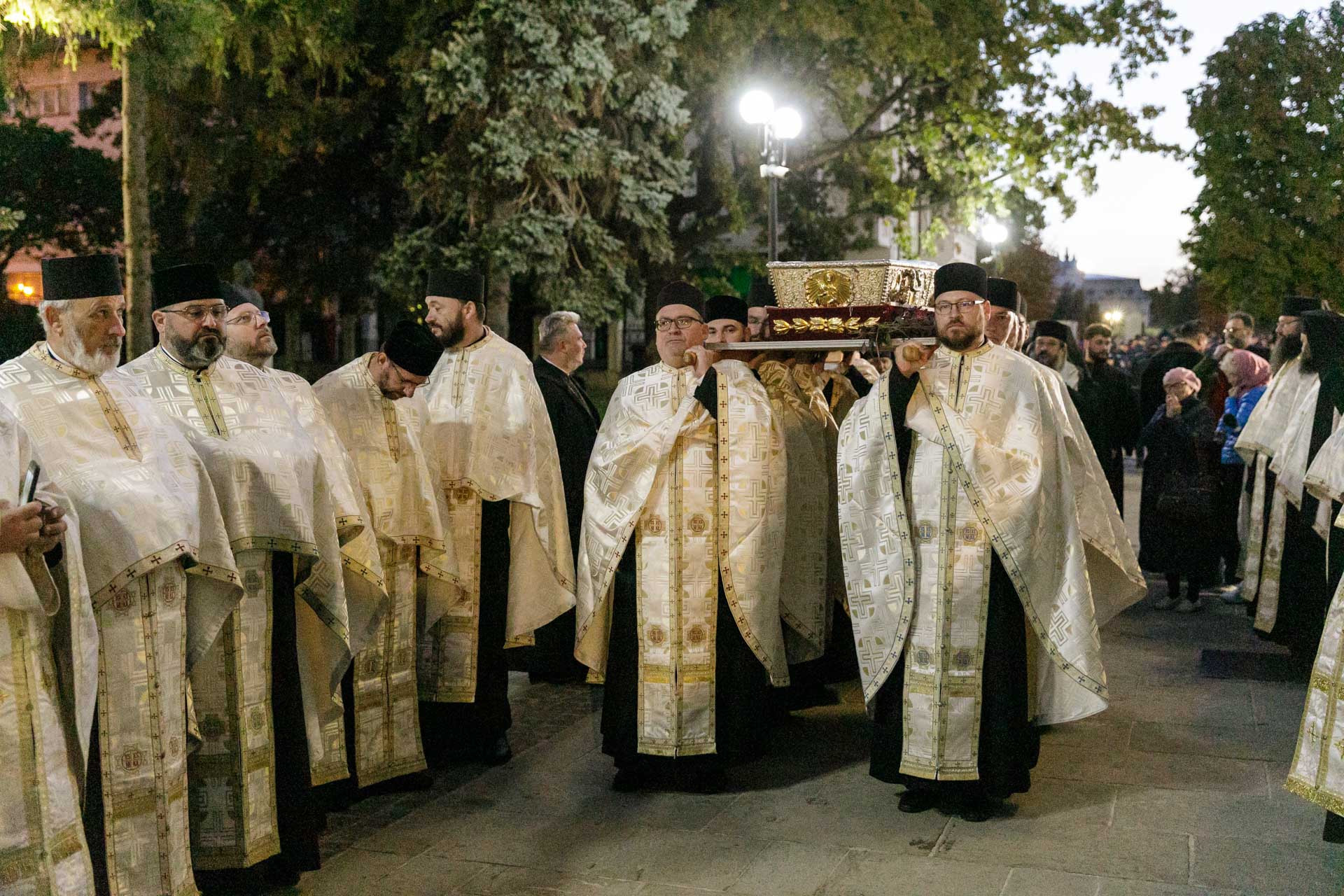 Şi în acest an, sărbătoarea Mitropoliei Moldovei şi Bucovinei a debutat cu tradiţionala procesiune a aşezării raclei cu moaştele Sfintei Parascheva în baldachinul amenajat în curtea Catedralei Mitropolitane.