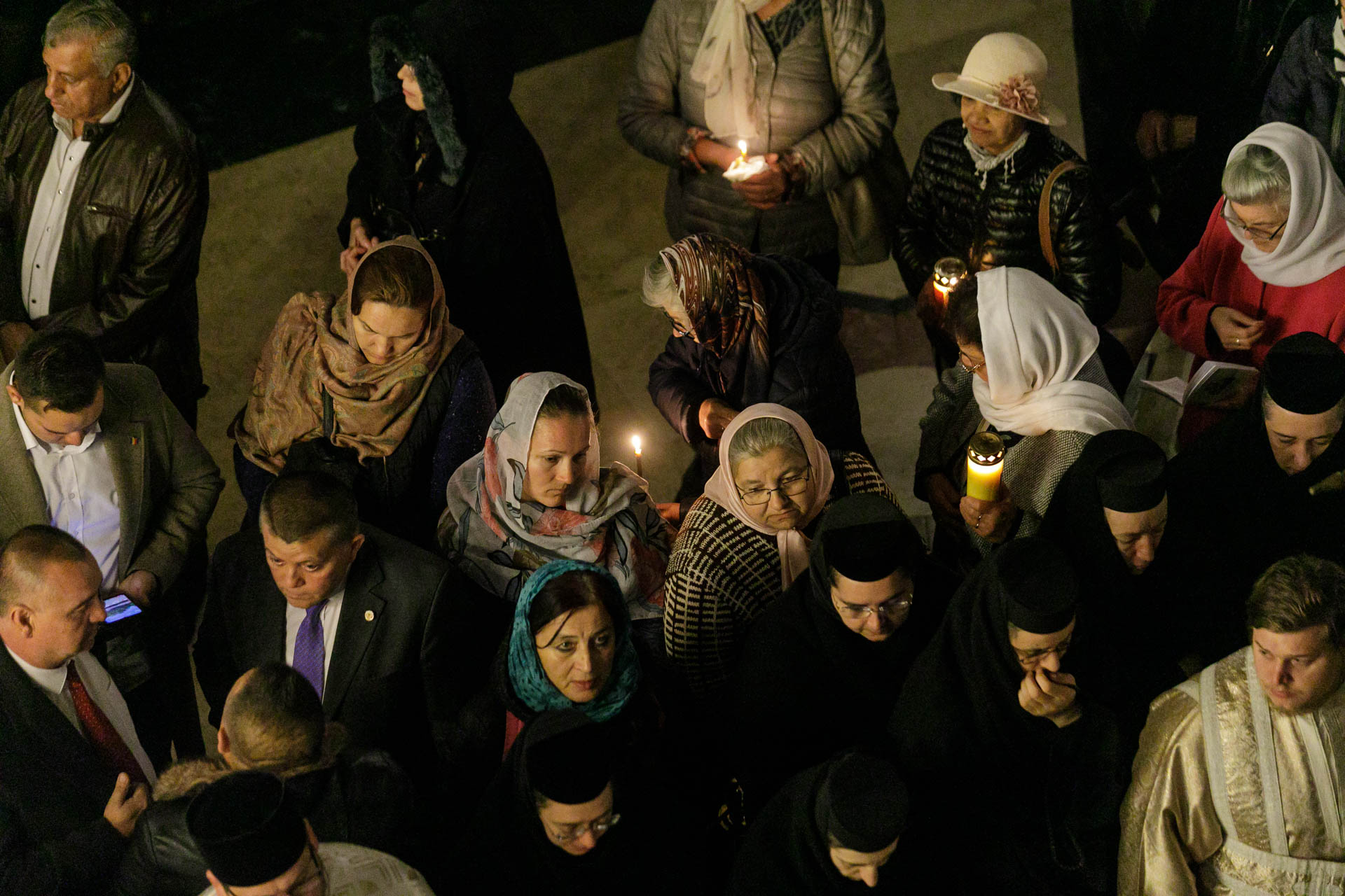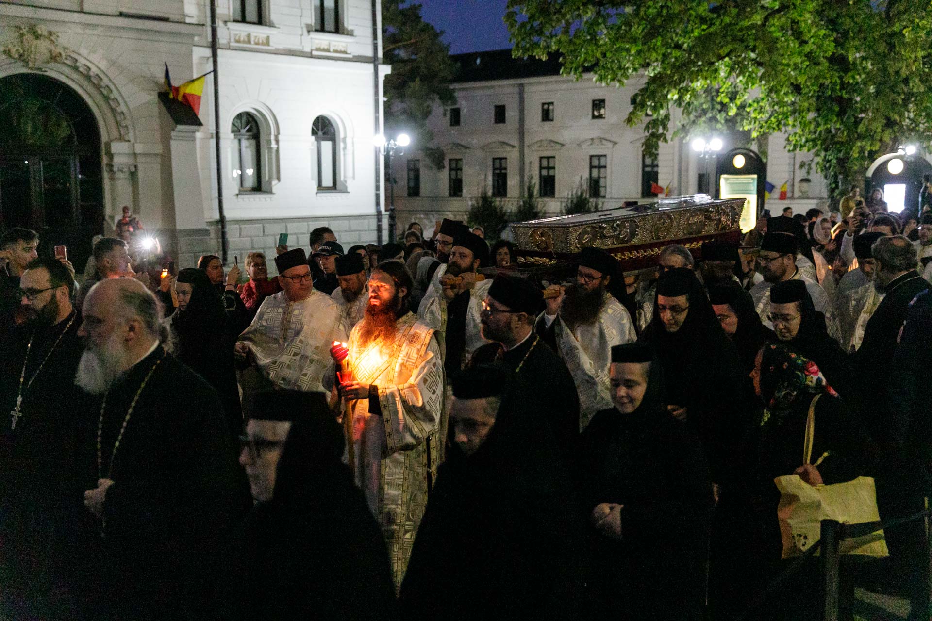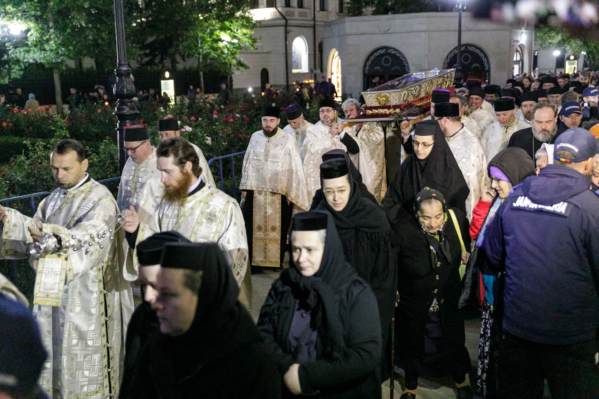 „Iată că astăzi ieşim cu sfintele moaşte afară, iar Biserica se lărgeşte, întreaga curte a Mitropoliei. Se lărgeşte pentru că mare este credinţa celor care vin să o cinstească pe Sfânta Parascheva. Vom împlini astăzi un mic pelerinaj în jurul catedralei, aşa cum o facem atunci când sfinţim Biserica. De data aceasta, primenind locul, primenindu-ne pe noi înşine, pentru că prin întâlnirea cu sfintele ei moaşte ne împărtăşim realmente de sfinţenia şi de puterea care le-a făcut nestricăcioase. O facem cu nădejde, ca viaţa noastră să devină pătrunsă de Lumina Învierii, aşa cum ele au devenit de Lumina nestricăciunii, nu doar să ne fie mai bine, nu doar să fim feriţi de criză şi de boli, şi mai ales în acestea, Domnul este cu noi. Aceste zile sunt pline de bucurie, când pelerini din toată ţara îşi uită de grijile lor şi de cele ale chivernisirii lor sau, mai degrabă, neuitându-le vin să se umple de bucuria sărbătorii pe care Domnul a împlinit-o”, a mărturisit PS Nichifor Botoşăneanul înainte de scoaterea sfintelor moaşte din catedrală.