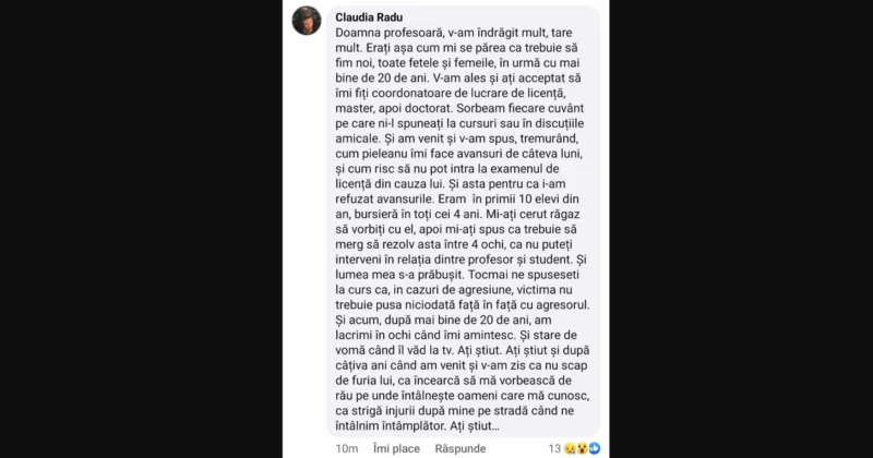 Tocmai ne spuseseți la un curs că, în caz de agresiune, victima nu trebuie pusă niciodată față în față cu agresorul. Și acum, la mai bine de 20 de ani, am lacrimi în ochi când îmi amintesc. Și stare de vomă când îl văd la TV. Ați știut! Ați știut și după câțiva ani, când am venit să vă zic că nu scap de furia lui, că încearcă să mă vorbească de rău pe unde întâlnește oameni care mă cunosc, că striga injurii după mine pe stradă când ne întâlnim întâmplător. Ați știut…”, a scris fata.