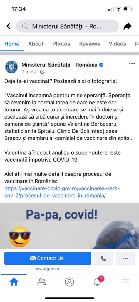 „Deja te-ai vaccinat? Postează aici o fotografie, a scris Ministerul Sănătății, sâmbătă, pe pagina de socializare, alături de o fotografie in care o femeie este vaccinată.