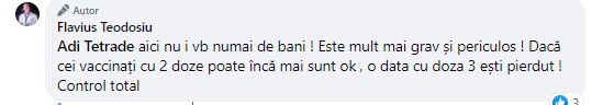„Aici nu-i vb numai de bani ! Este mult mai grav și periculos ! Dacă cei vaccinați cu 2 doze poate încă mai sunt ok , o data cu doza 3 ești pierdut ! Control total”, a scris Teodosiu.
