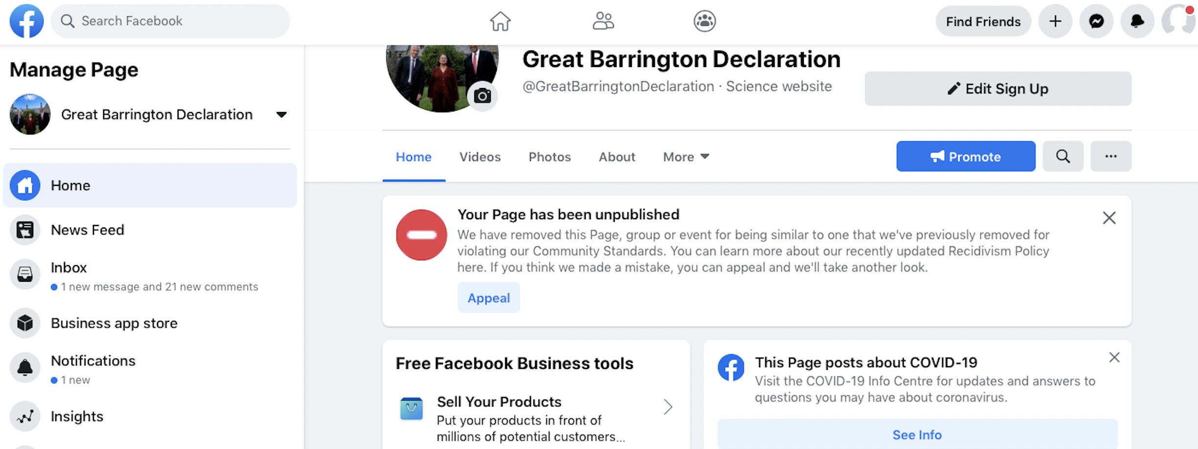 Pagina oficială a Declarației de la Great Barrington a fost ștearsă de pe facebook, a anunțat pe Twitter unul dintre administratorii acesteia. Textul în românește al Declarației a fost publicat în premieră de R3Media.