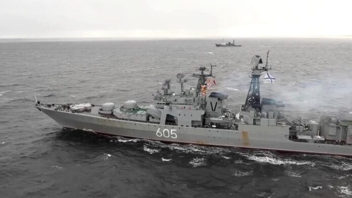 Ceea ce pare a fi o înregistrare cu camera de corp a unității navale, arată militari ruși cu arme automate care verifică nava și intră pe punte.