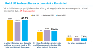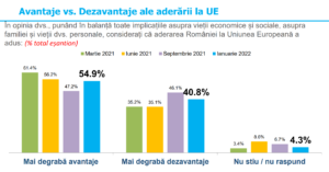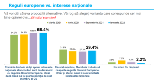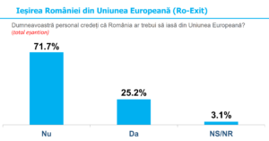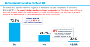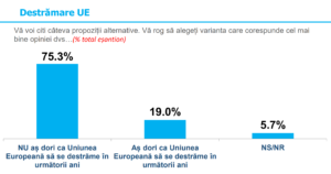 Legat de Uniunea Europeană și apartenența României la blocul comunitar, oamenii sunt în mare măsură mulțumiți și spun că calitatea de membru a UE e în interesul național al țării. Totuși, remarcăm un puternic val de euroscepticism și totodată de oameni care ar dori să părăsim Uniunea (25,2%) sau chiar ca aceasta să se destrame (19%).