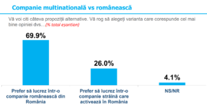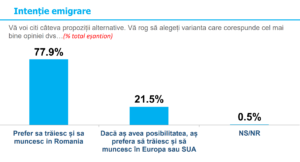 În cea de-a doua parte a sondajului, s-a vorbit despre naționalism, despre economie autohtonă, despre Unire. Aproximativ 78% dintre respondenți își doresc să muncească și să trăiască în țară. Legat de muncă, cca. 70 de procente preferă, mai degrabă, să muncească în România pentru o companie românească.