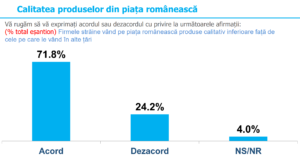 Despre calitatea produselor străine fabricate pentru România față de cele fabricate pentru alte țări, peste 71% dintre oameni sunt de acord că cele făcute pentru spațiul românesc sunt mai proaste în calitate.