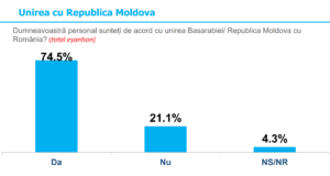 Legat de Unirea cu Republica Moldova, cu Basarabia, românii de la vest de Prut sunt în mare măsură de acord. Aproape 75% susțin și își doresc o reunire cu teritoriul pierdut în 1940 care este chiar și astăzi populat preponderent cu români.