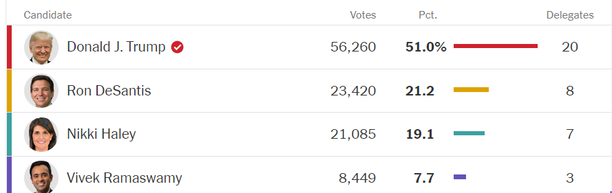 Conform rezultatelor, Trump a obținut 51% dintre voturi, fiind urmat, la mare distanță, de guvernatorul Floridei, Ron de Santis cu 21,2%, locul trei fiind al lui Nikki Haley, cu 19,1%.