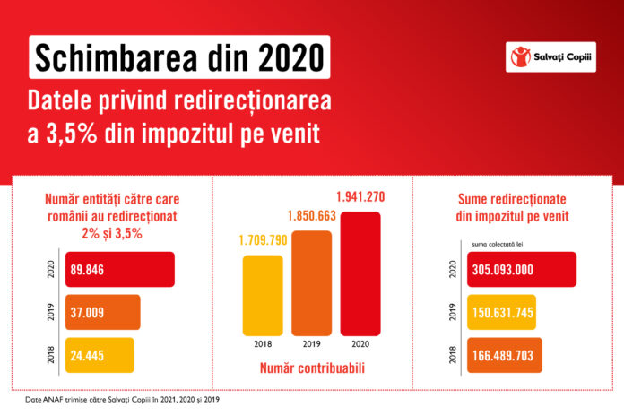 Potrivit datelor comunicate de ANAF la solicitarea Salvați Copiii, suma totală colectată în anul 2020, pentru anul de realizare a venitului 2019, prin mecanismul de redirecționare a unei cote parte din impozitul pe venit (2% și 3,5%) a fost de 305,93 milioane lei, față de 150,6 milioane lei în 2019. Aceeași sursă precizează că un număr de 115.987 de companii au înregistrat profit, iar un număr de 763.409 de microîntreprinderi au desfășurat activitate economică generatoare de venituri.