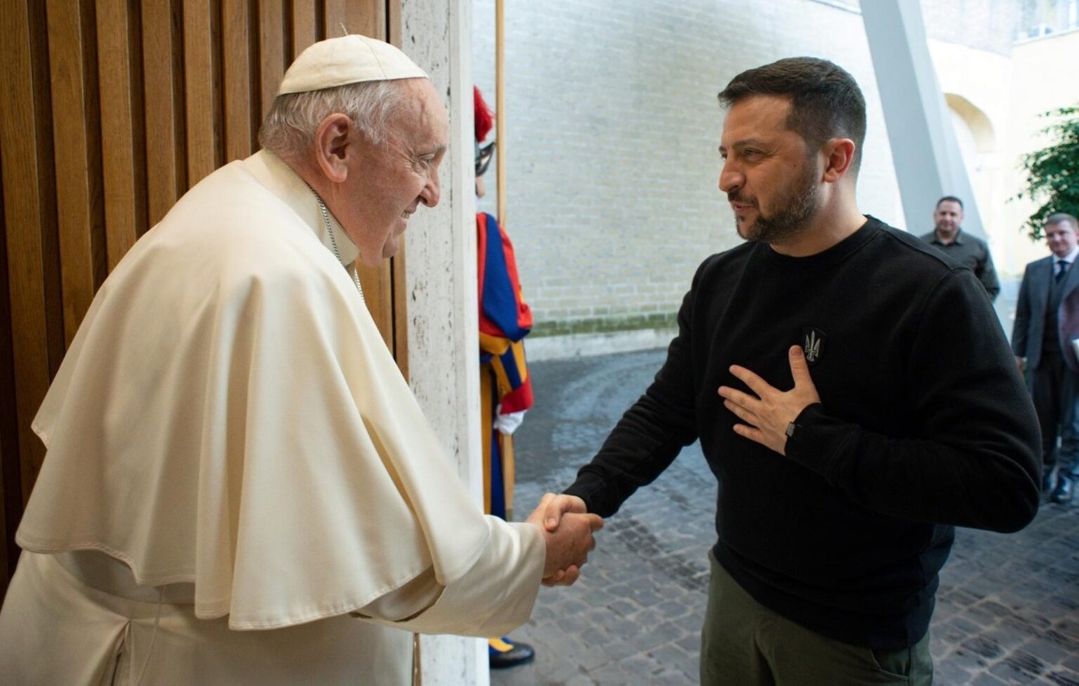 ”Este o mare onoare”, i-a spus Zelenski lui Francisc, punându-și mâna la inimă și plecându-și capul în timp ce îl saluta pe papa, în vârstă de 86 de ani, care stătea în picioare cu un baston.